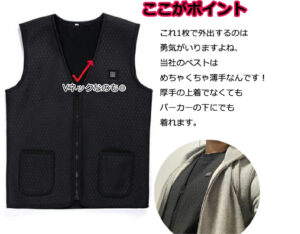 私も昔、スーツを着て営業してた頃は、それこそヒートテック着て、Yシャツ着て、ベストやカーディガン着て、スーツの上着着て、コート着て・・・みたいなパンパンの状態で出かけてました。もしあの時この電熱ベストがあれば・・・多分Tシャツ、Yシャツ、電熱ベスト、スーツの上着、薄手のコートで十分だったかもしれませんね。