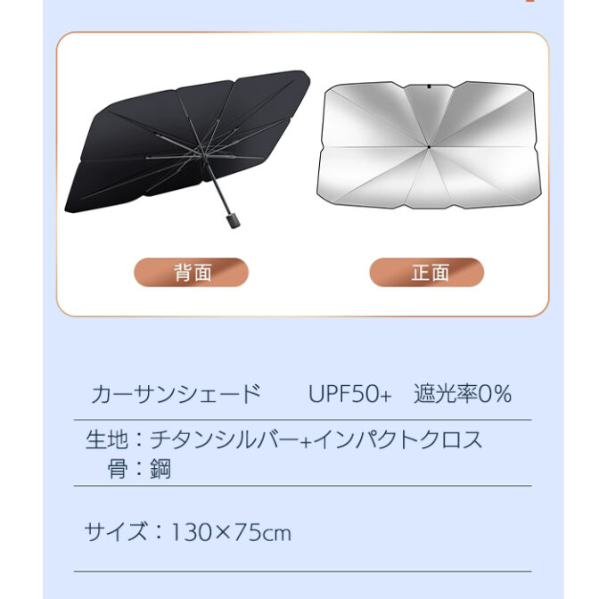 ◆カーサンシェード◆サイズ:130×75cm材質:チタンシルバー+インパクトクロス◆骨部分:鋼◆カバー:合成皮革